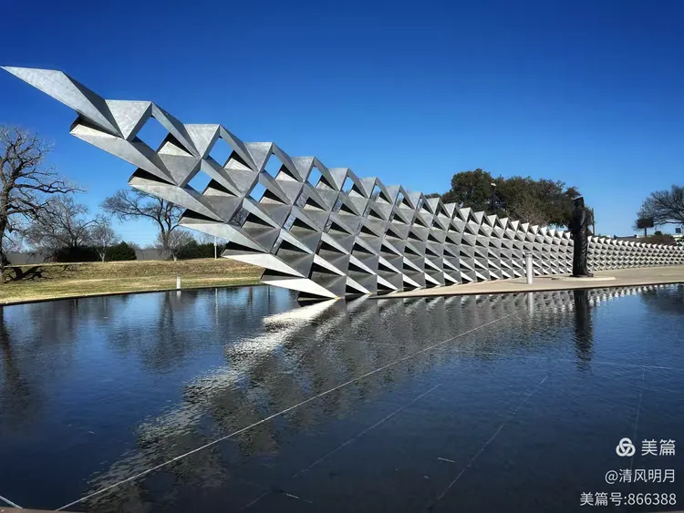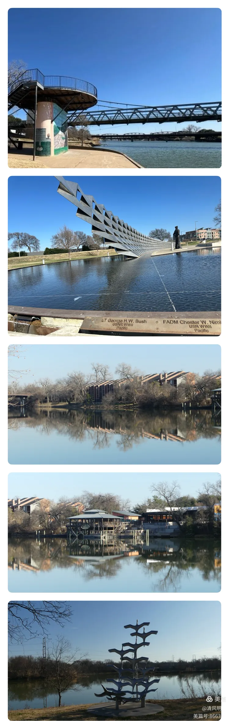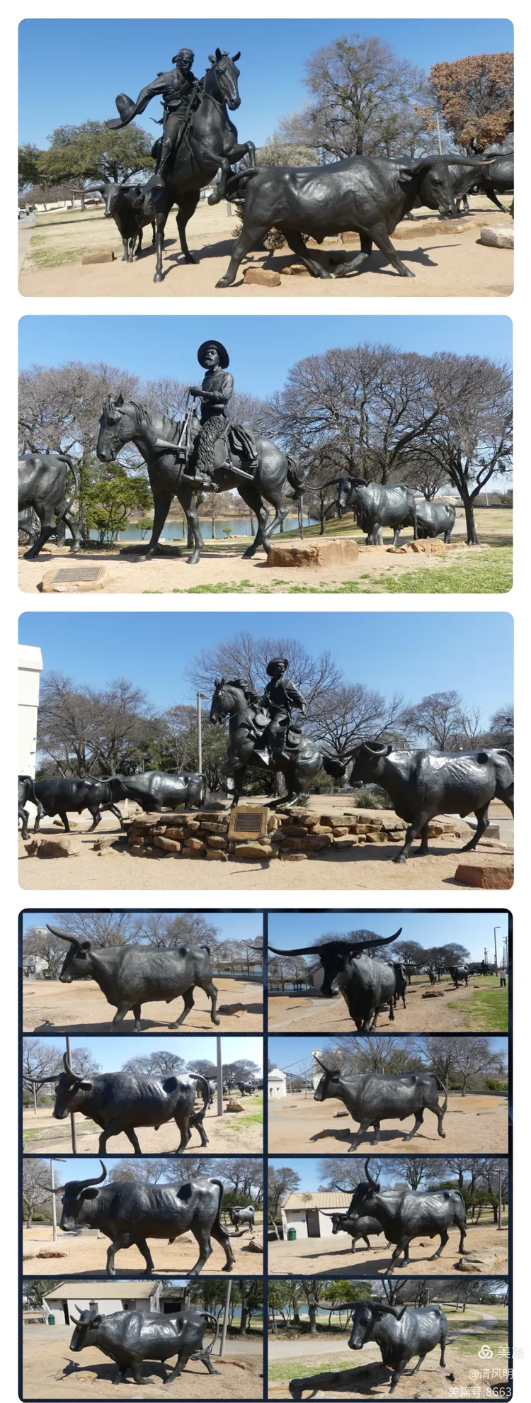 达拉斯有举世闻名、气势磅礴的达拉斯赶牛(Dallas Cattle Drive )雕塑:40多头真尺寸青铜牛 + 3名牛仔,像西部大片定格。没想到韦科桥边居然也有 【韦科奇泽姆小径赶牛】(Waco Chisholm Trail Cattle Drive)雕塑,20多头牛的形态各异,栩栩如生,演绎当年赶牛过河的场景——妥妥的小说封面画面,值得来打卡。