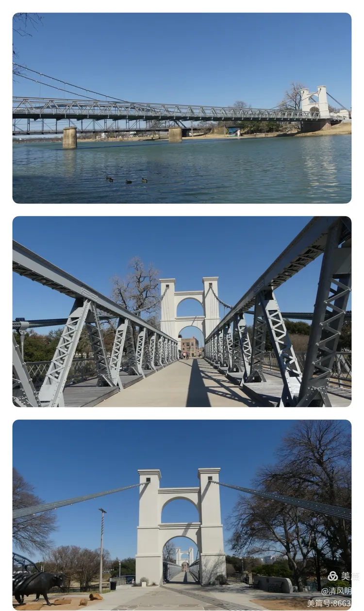 1870年建成、横跨布拉索斯河(Brazos River)的韦科悬索桥(Waco Suspension Bridge ),是奇泽姆小径的一条通道。当时是世界上最长的单跨悬索桥、德州的高科技工程。后来旧金山的 金门大桥(Golden Gate Bridge )横空出世后,它一下成了“约1/9主跨长度的迷你版”——虽气势不同,原理相同。