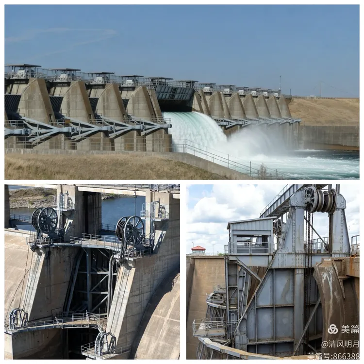 韦科水坝采用的是由 Jeremiah Burnham Tainter 在 19 世纪末发明的径向弧形闸门(Tainter gate)。这种闸门通过大型卷扬轮(hoist drum/wheel)与链条、钢缆或齿轮系统相连。
