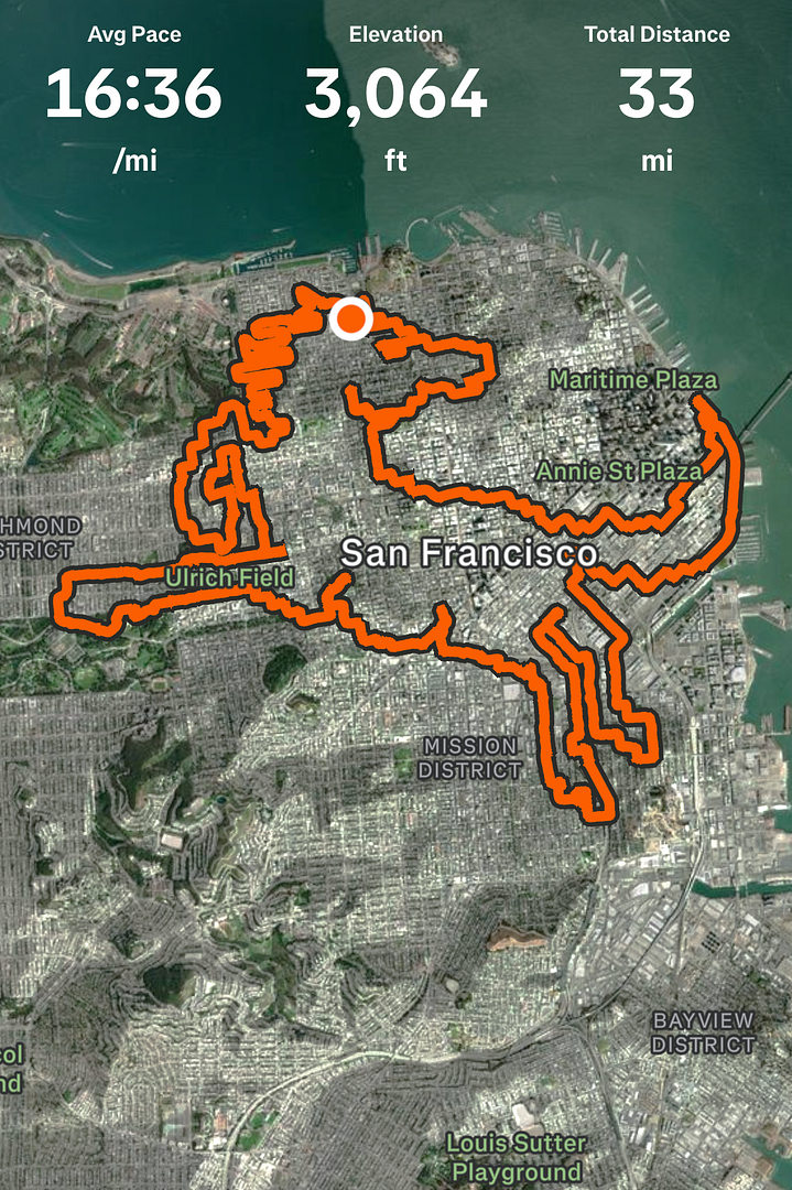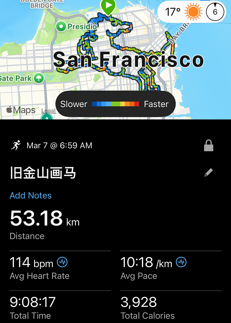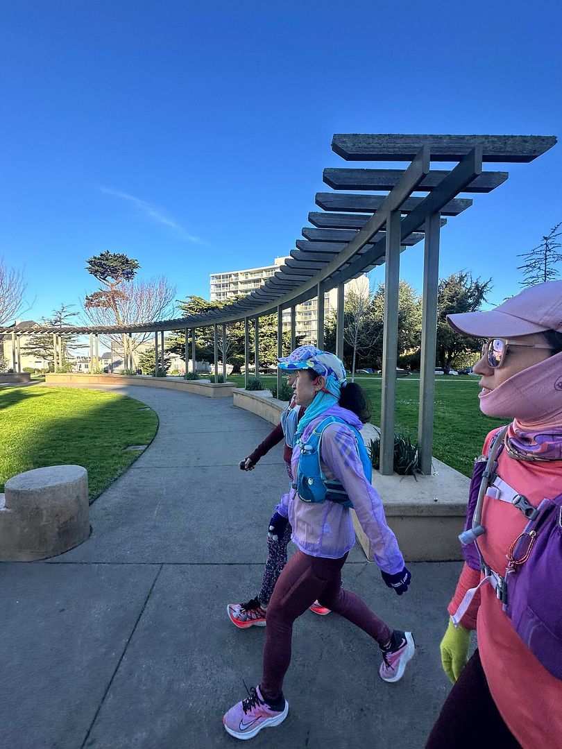 因为各种赛事和跑步活动的干扰,最早的大年初一的活动,最终推迟至2026/3/7成行。一行9人,跑步距离53公里,用时9小时,驾车2小时。整个行程还算顺利,仅仅只有2处的轨迹出了幺蛾子,被迫短暂停表,以便求得轨迹的流畅。早上6点,大家伙在84X101附近的麦当劳停车场碰头,分乘麦哥和本人的座车,前往60公里外的旧金山起点。