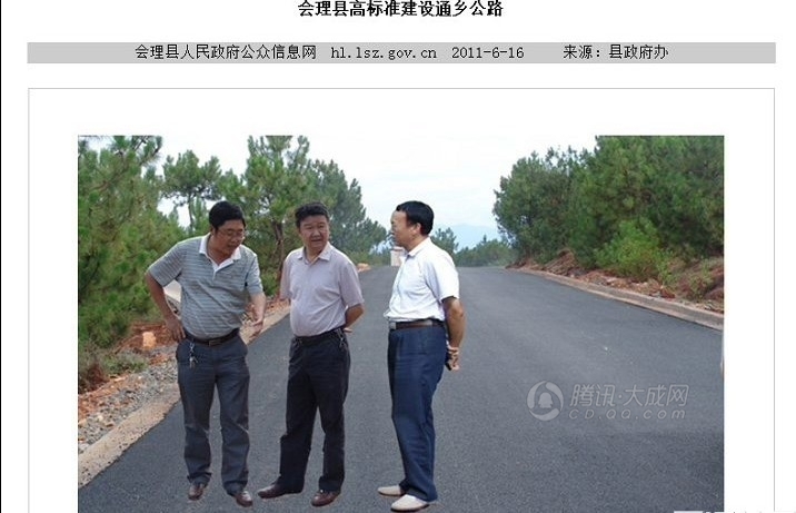 今天上午,会理县政府的网站已经无法打开。记者从搜索引擎的缓存中看到,该网站于6月16日在首页发布了一条题为《会理县高标准建设通乡公路》的新闻,并把相片放至头条位置。网友发布的截图上显示,该新闻标题下的第一张相片中,三位县领导的图像被“贴”到了一条公路的背景上,看上去就像浮在公路的上空,PS合成的痕迹非常明显。相片下的图片说明称这几位领导正在当地某乡镇检查新建成的通乡公路,文字则对这次检查的情况进行了描述,记录了县领导对通乡公路下一步建设的“四点要求”。