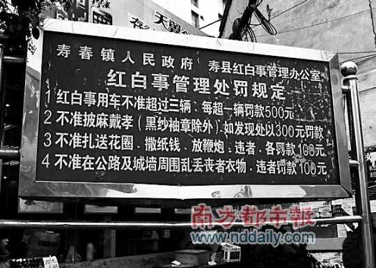 杨先生在微博中公布的照片显示,一则抬头为“寿春镇人民政府、寿县红白事管理办公室”的《红白事管理处罚规定》被印在一个标牌上,竖立在街头,上面确有“不准披麻戴孝(黑纱袖章除外),如发现处以300元罚款”的禁止性规定。对此,记者联系上了寿春镇民政办的赵主任。赵主任告诉记者,据其了解,《红白事管理处罚规定》是寿县民政部门几年前制定的,寿春镇政府负责具体实施。
