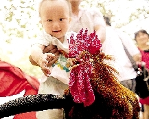 “九斤”是黄海涛从小养大的,他儿子程程今年9个月大,可以说,程程是伴着“九斤”一起成长的。正因为这样,程程和“九斤”关系特别好,程程从来不怕它,总是撵着“九斤”跑,抓它的鸡冠、摸它的羽毛,“九斤”不躲不闪。