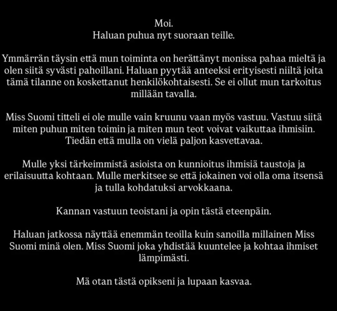 环球小姐的芬兰分部官方在一周内持续回应此事,发布了多篇道歉声明,重申了选美比赛的价值观,称绝不接受任何形式的种族主义或歧视行为。