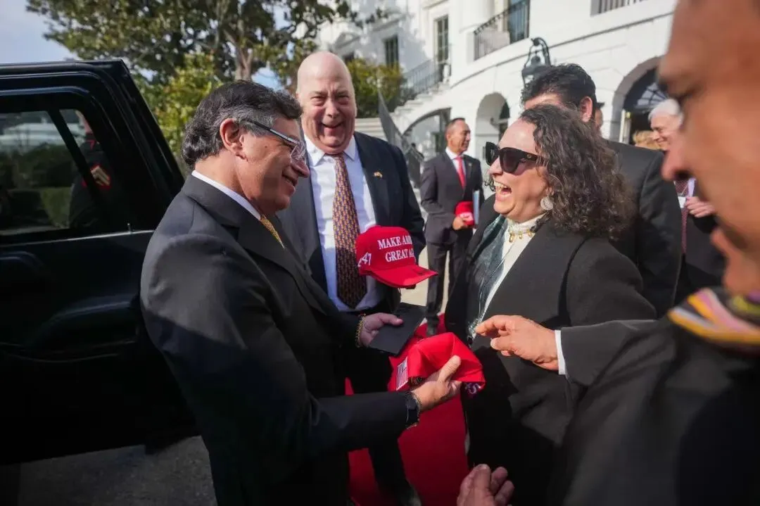 特朗普签名送书,而且是1987年出版的著作,他还对佩特罗各种夸;佩特罗则特意戴上特朗普最喜欢的金色领带,而且,临走时,还拿走了一顶又一顶的“让美国再次伟大”的帽子。
