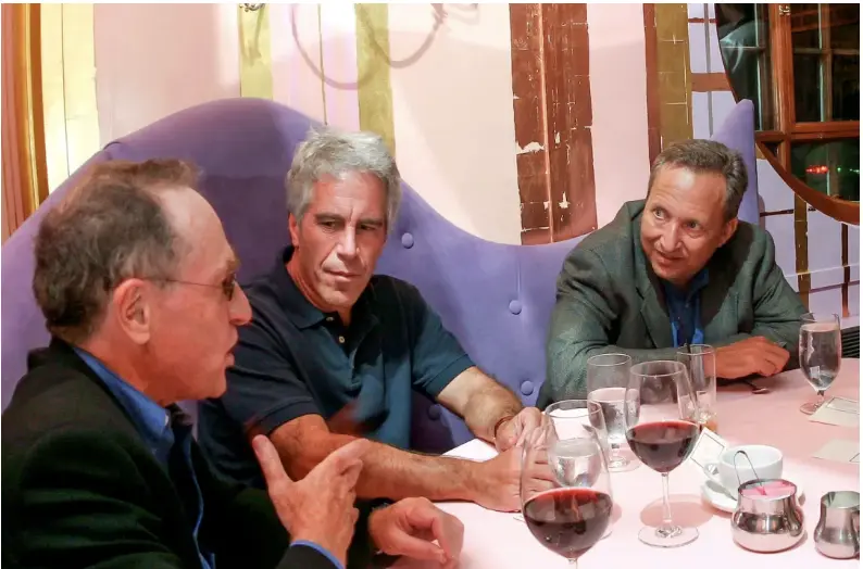 ■登上美国各大媒体头条的照片,中间是爱泼斯坦,右边是今天主角哈佛前校长劳伦斯·萨默斯,他同时也是哈佛肯尼迪学院莫萨瓦尔-拉赫马尼商业与政府中心主任