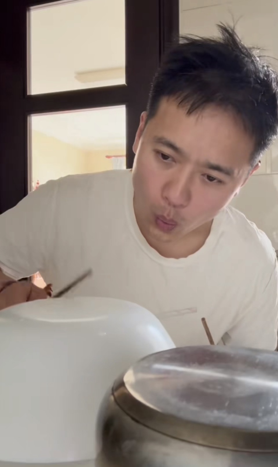 高云翔不仅给父亲准备了长寿面,还买了一个小小的生日蛋糕,把奶油抹在父亲鼻子上。虽然只有父子两个人,但是氛围很欢乐。