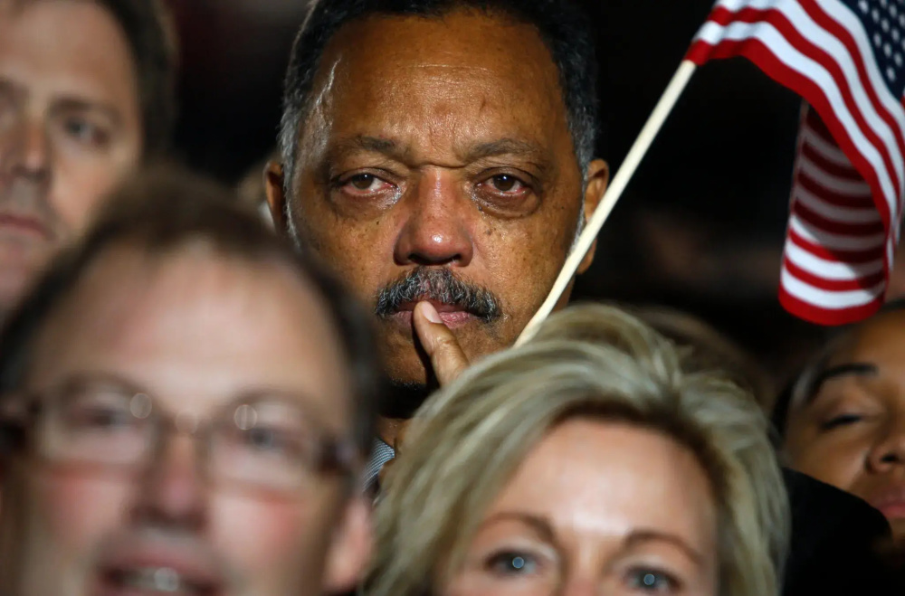 2008年奥巴马胜选夜,芝加哥格兰特公园人群欢呼,镜头捕捉到杰克逊泪流满面。他后来解释,他是为那些没有看到这一天的人而哭:金、阿伯内西、梅德加·埃弗斯、范妮·卢·哈默,以及南方运动者。