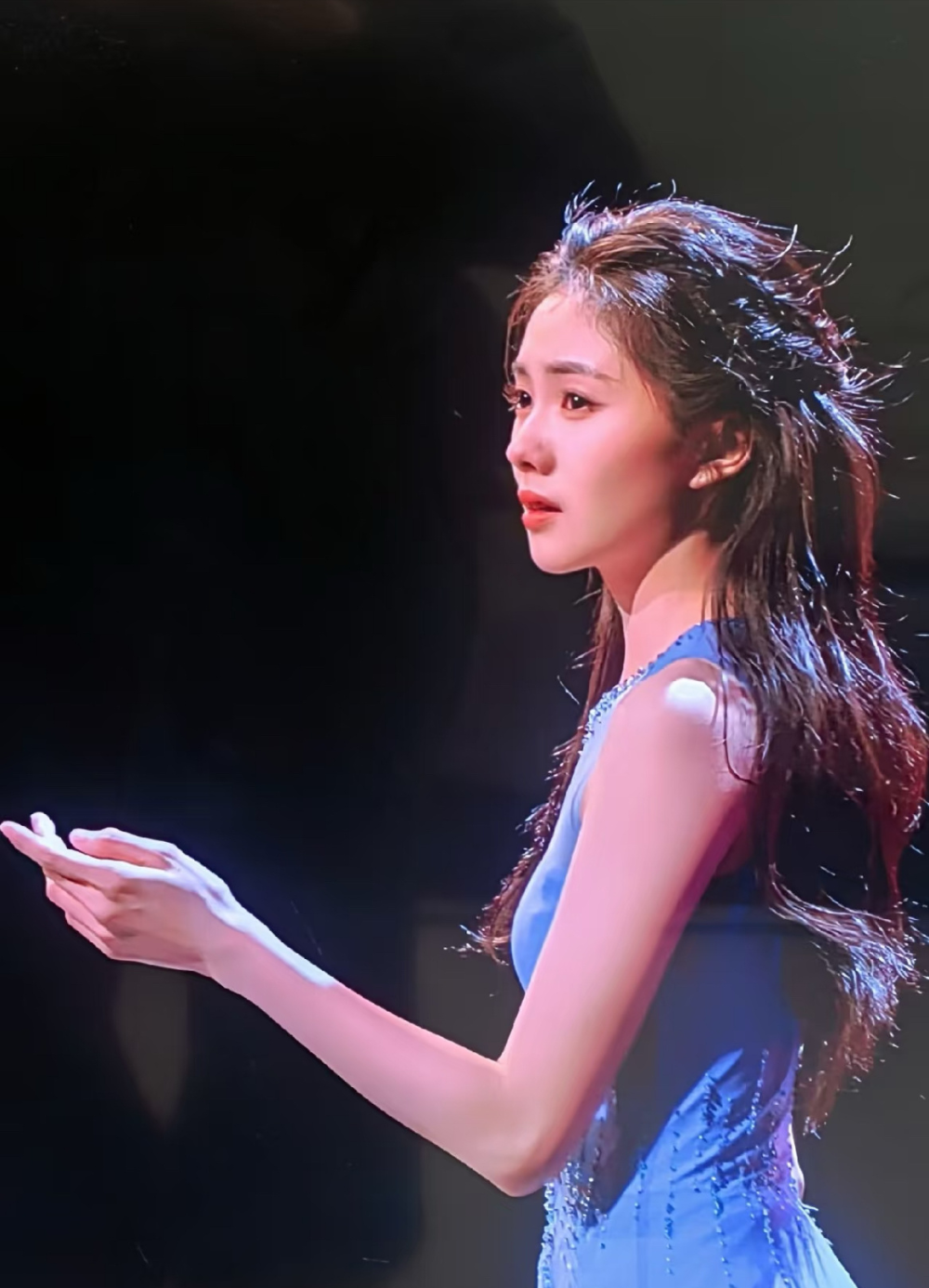 但到了舞台上,伊能静气血十足、容光焕发,一身淡蓝色水钻礼服典雅大气,勾勒出玲珑曲线,令人直呼:岁月从不败美人!