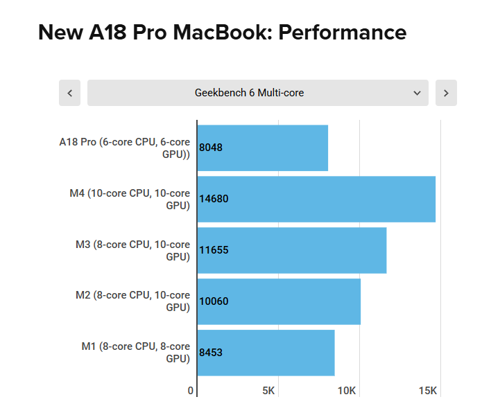 根据Geekbench 6基准测试数据,A18 Pro的单核性能与M3相当,但由于只有6个CPU核心,其多核性能略逊于拥有8个核心的M1。这意味着搭载A18 Pro的MacBook性能将与搭载M1芯片的MacBook Air大致相当,对于网页浏览、文档编辑、媒体播放等日常任务而言,这样的性能已经绰绰有余。