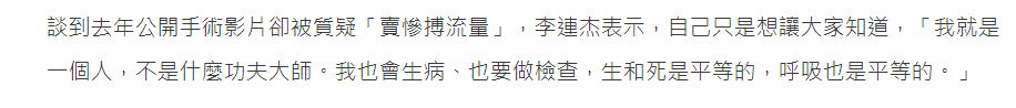 当谈到去年公开手术影片却遭到“卖惨博流量”的质疑时,李连杰认真地说:“我就是想让大家知道,我就是个普通人,不是什么高高在上的功夫大师;我也会生病,也得去做各种检查,在生死面前,人人平等,呼吸也是平等的。”