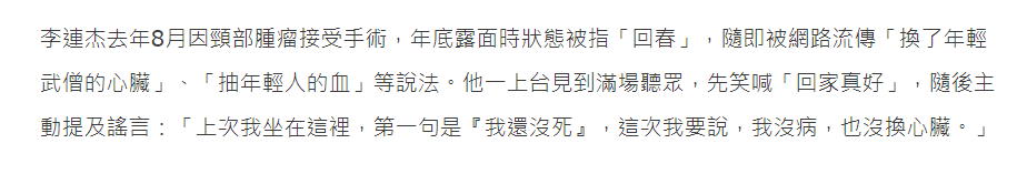 台媒报道称,李连杰一登上讲台,看到台下座无虚席的听众,脸上立刻绽放出灿烂的笑容,大声说道:“回到这儿,就像回了家,真好!”紧接着,他主动提及那些谣言:“上次我坐这儿,第一句话就是‘我还没死呢’,这次我得郑重声明,我没病,也没换心脏。”他语气坚定地表示:“我心脏健健康康的,换它干啥?”对于“换血”“抽取小孩血液”这类说法,他更是半开玩笑地调侃:“这也太残忍了吧!还有说我养小鬼的,我养那玩意儿干啥呀?总得有个目的吧,是为了延年益寿,还是为了发大财?我都没有这想法。”