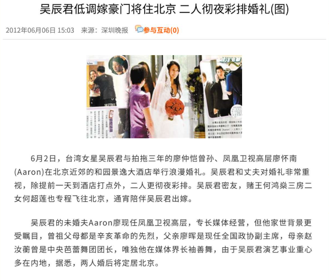 其丈夫廖怀南家世非常显赫,大概也是因为吴辰君才格外低调。