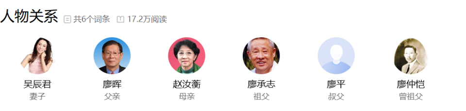 父亲廖晖是第11届全国政协副主席,母亲赵汝蘅曾是中央芭蕾舞团团长。
