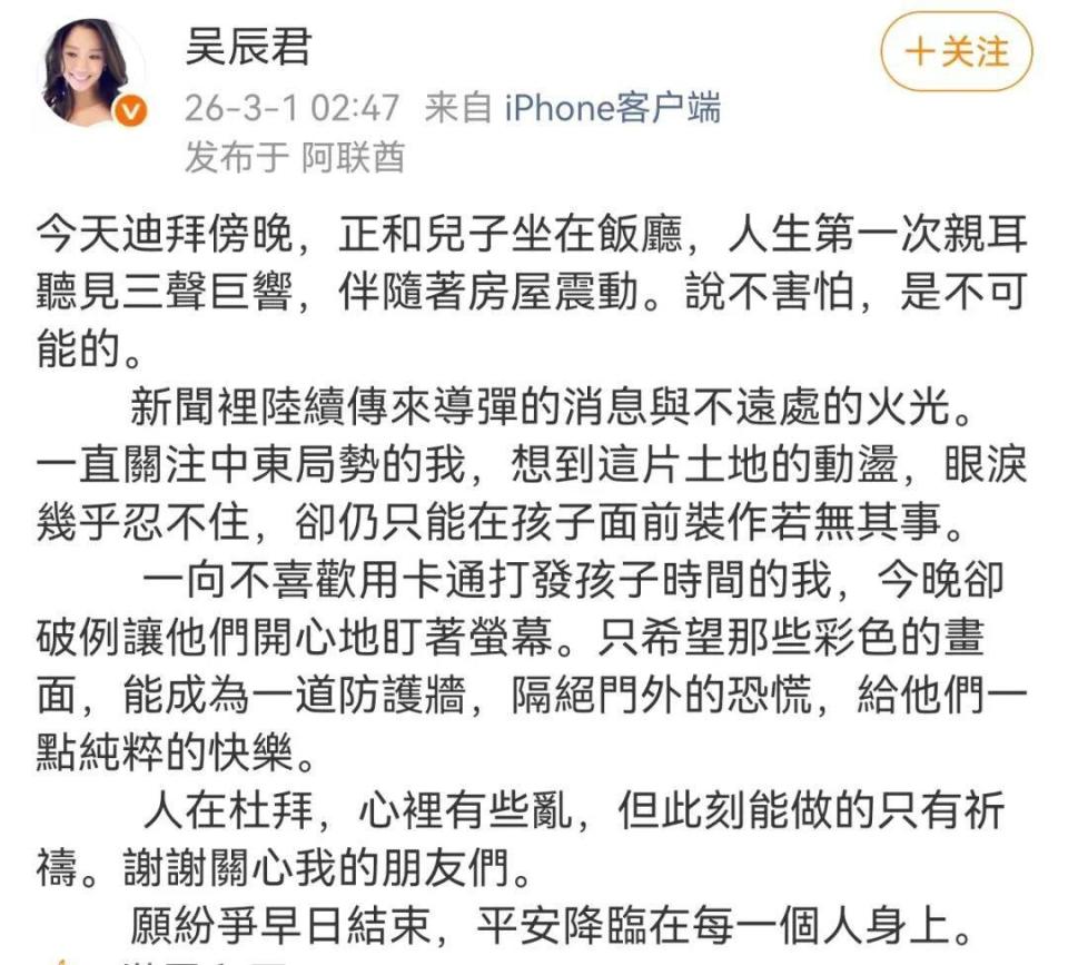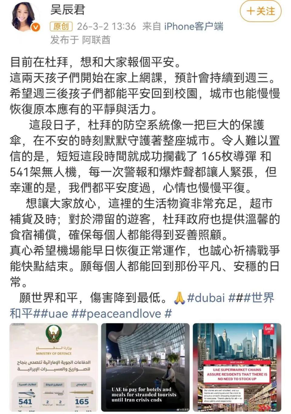 只是没想到,才移居两年,迪拜就被殃及,好在目前情况已经稳定,吴辰君的社交媒体也没有提及要离开的打算,希望他们平安。
