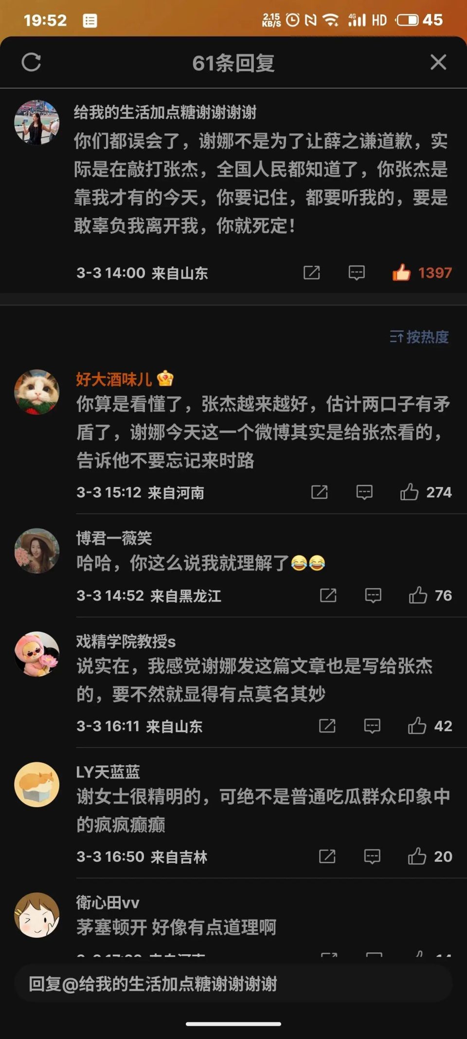 本来把,张杰现在可以靠唱功当半个老艺术家了,结果别人薛之谦俩的互撕,谢娜跑出来掺一脚,有点像马苏掺合李小璐和贾乃亮,但是马苏只是想小事化了,谢娜纯是引火烧身,发言就和她主持一样不经大脑