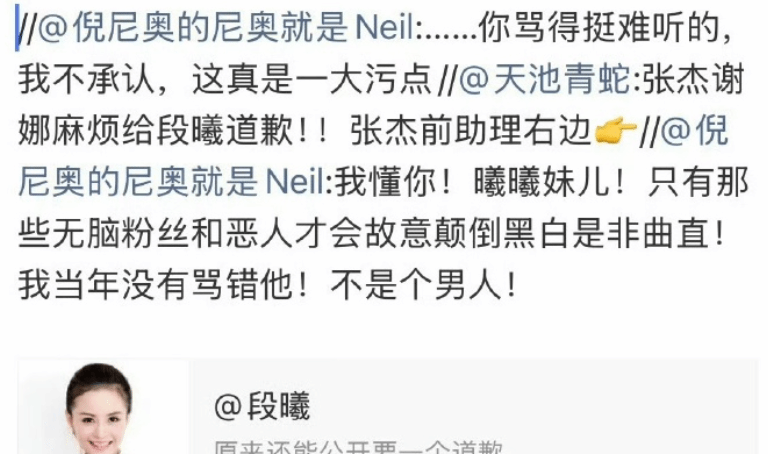 该网友账号为“倪尼奥的尼奥就是neil”,在段曦发布千字长文控诉张杰出轨、遭多年网暴后,他第一时间转发声援,措辞激烈地指责张杰人品堪忧,强调“当年没有骂错他”,还痛批粉丝“颠倒黑白”。