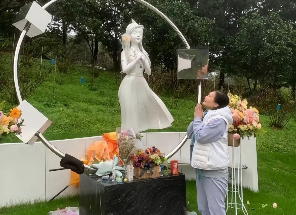 S妈一身休闲装,白色羽绒马甲搭配白鞋,她双手合十,紧闭双眼,和大S的雕像遥相呼应,脸上看似平静,却藏不住憔悴,网友看了直言心疼。