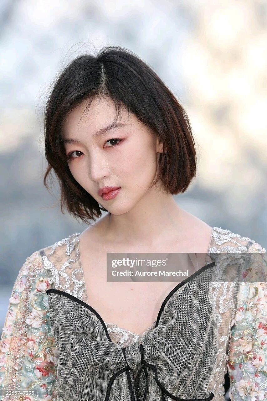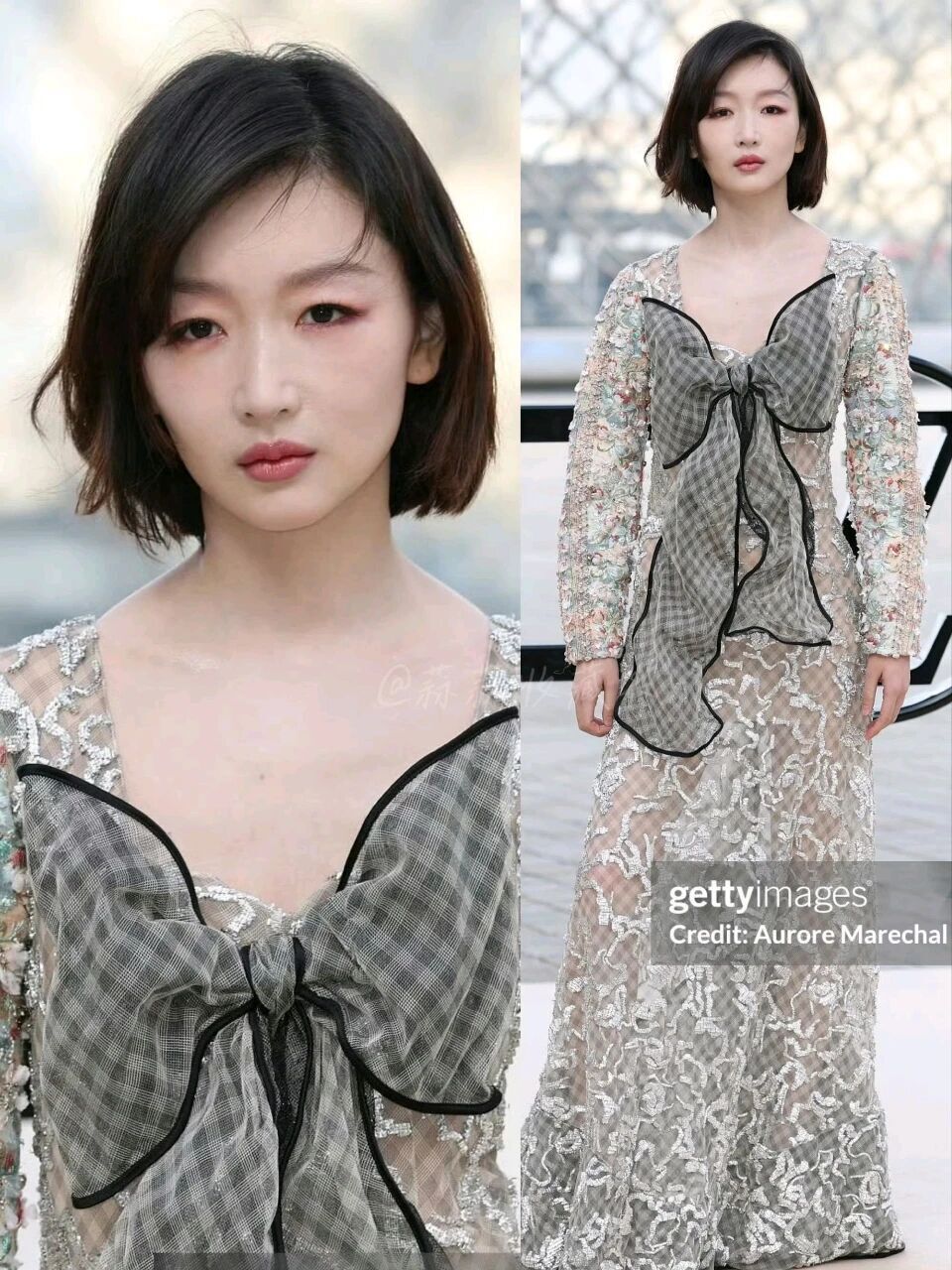 而周冬雨走的是另一种风格,她穿的是银白亮片透视蕾丝长裙,胸前还点缀着一个巨大的黑灰色蝴蝶结,搭配她的短发,甜酷感一下子就出来了。亮片在光照下一闪一闪的,有人说这衣服像“流动的星河”,不得不说,这种柔美长裙和利落短发的碰撞,确实很有记忆点。