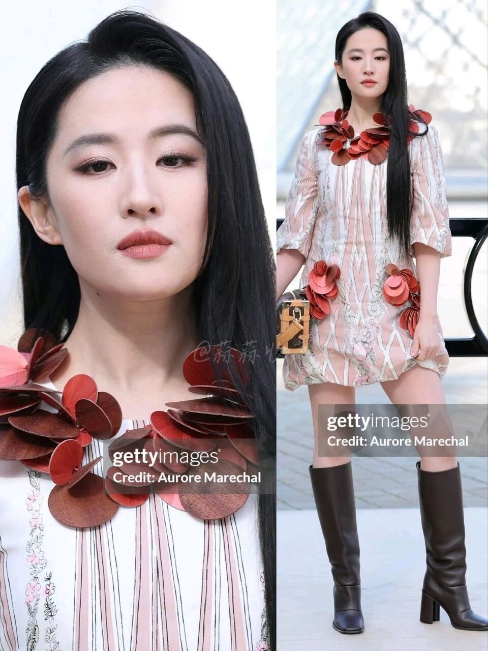 刘亦菲穿的是红色立体花瓣装饰的短裙,搭配标志性的黑长直,整个人又冷又艳,外媒都夸她是“行走的玫瑰花”,一点不夸张。