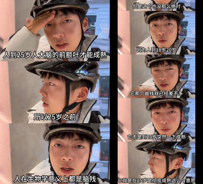 他在视频里使用的一些调侃玩笑颇为出圈,像是“人到25岁大脑的前额叶才能成熟,所以25岁之前人在生物学意义上都是脑残”“建议把前额叶纳入择偶标准”。