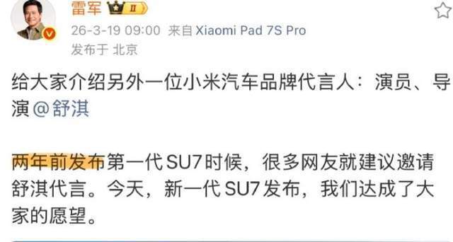 时间拨回两年前初代SU7亮相之时,车型代号“SU7”与影星“舒淇”名字的高度谐音,在互联网上催生了无数趣味调侃与自发呼吁。彼时,大量网友涌入雷军及小米相关评论区,戏称“代言人已就位”,力荐舒淇。然而,这一波声量在当时并未被立即采纳。雷军笑着回忆,当时现场粉丝热情高涨,“他们觉得我代言就行了”,创始人自身的光环一度覆盖了外界的声音。