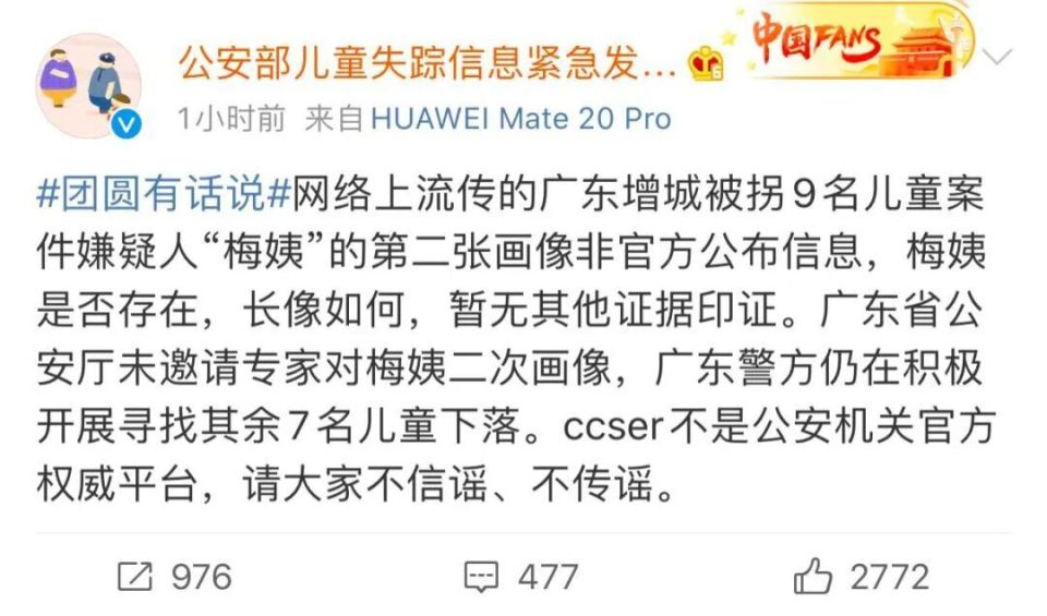 然而,即使是万能的互联网,也没能找到梅姨的下落。反而是这张照片,很快就被公安部的官方微博辟谣了: