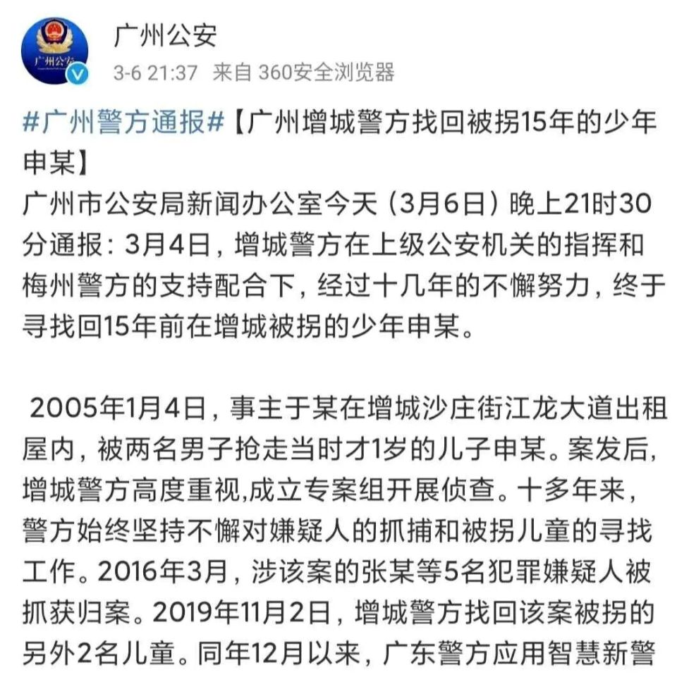 2026年3月21日,广州警方宣布,“张维平等人拐卖儿童案”取得重大进展,犯罪嫌疑人谢某某(女)落网。