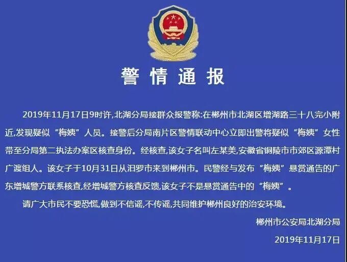 梅姨横空出世的那一年,广东佛山和清远、浙江金华、湖南郴州等地都传出疑似梅姨的妇女现身的消息,但最后无一例外,都被警方确认为不实消息。