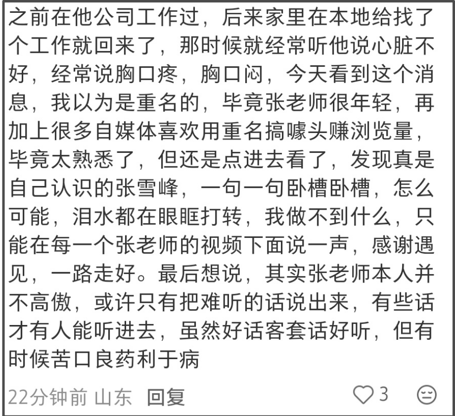 在张雪峰公司工作过的员工,还主动出来为他说话,却也提到张雪峰生前时常觉得心脏不舒服。