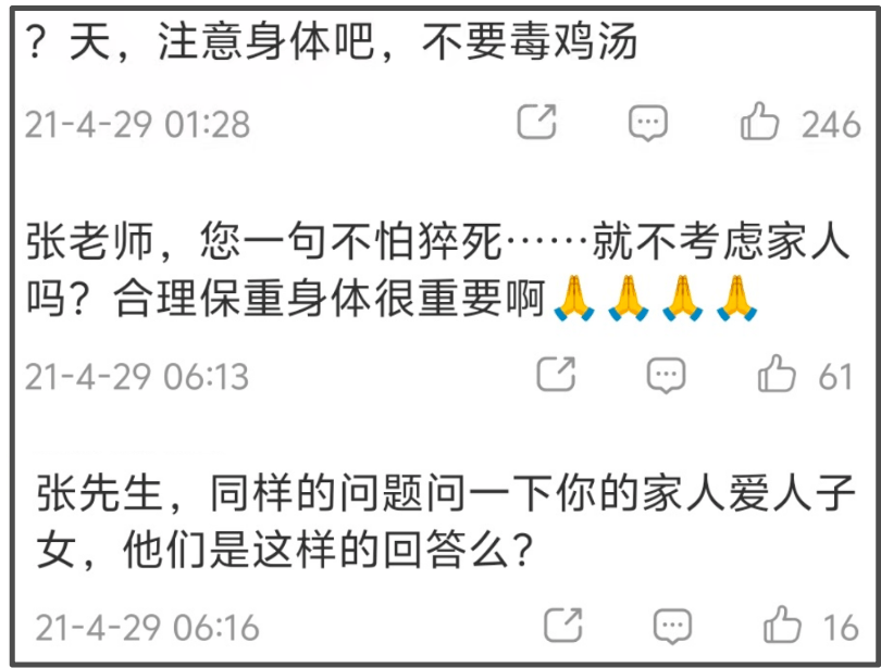 其他网友纷纷表示张雪峰喊话不怕猝死实属毒鸡汤,让他多为家人爱人子女考虑……
