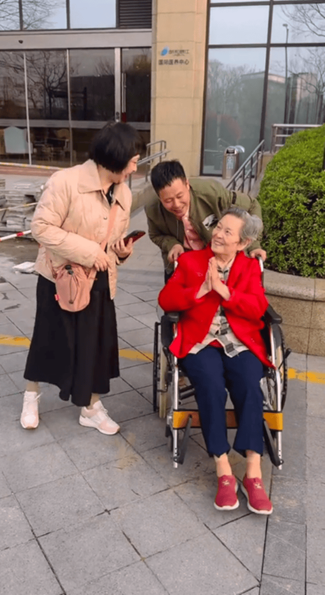 随后惜春等人离开时,周贤珍还坐在轮椅上将他们送到疗养院外,坐在轮椅上的周贤珍,双手合十置于胸前,面带慈祥而满足的微笑,眼神温和地望向身旁的惜春,流露出亲切与感激之情。她的姿态端庄而放松,虽年事已高,但精神状态极佳,笑容中透着历经岁月沉淀后的从容与喜悦。