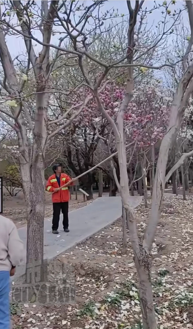 3月29日,有网友发布视频称,在北京市兴隆郊野公园内,一位身着制服的工作人员手持竹竿,打落树上正盛开的花朵。