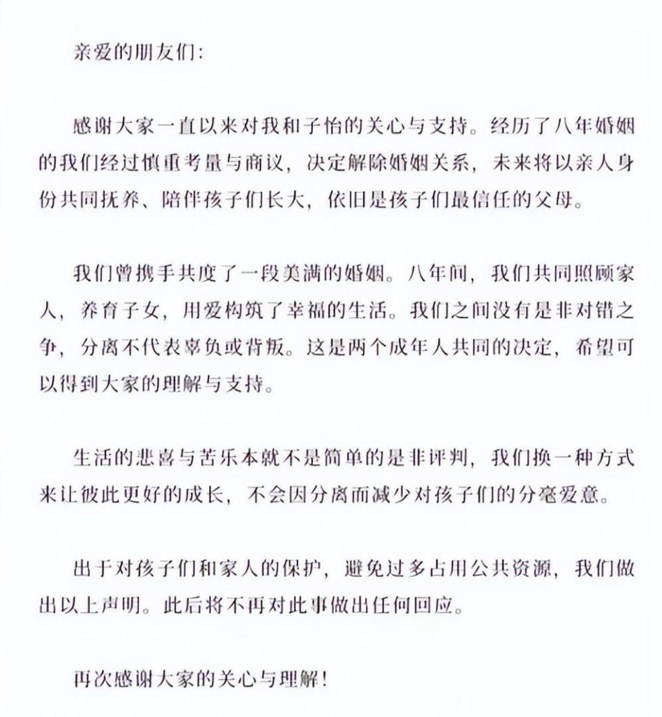 2023年10月23日,俩人同时发声明,八年婚姻画上句号。