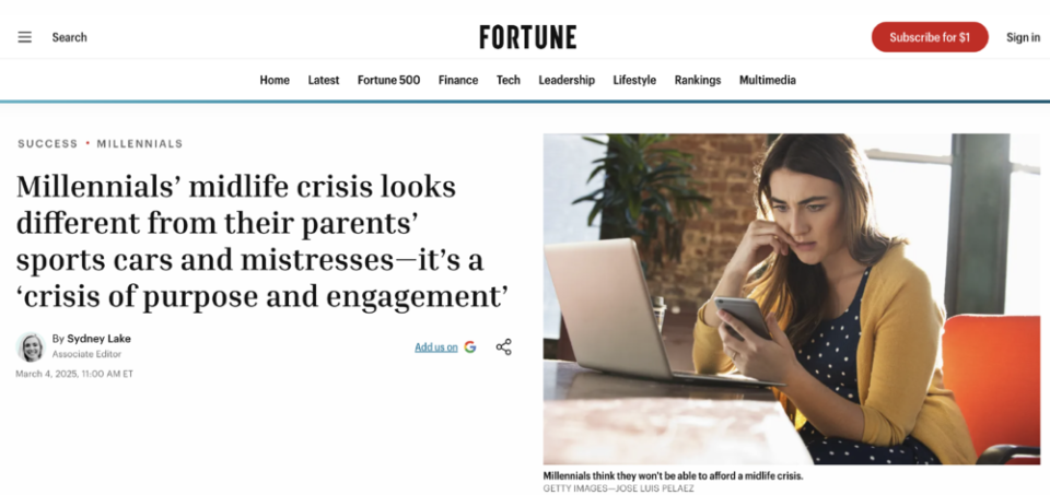 正如《财富》杂志在前一阵的相关讨论中所指出的,成长于经济上行期受到20世纪价值观影响的千禧一代(1981-1996生人),在这个震荡时代所面对的中年危机已经不再是我是否足够成功,而是目标和参与感的危机。